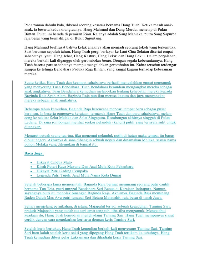 Hang mahmud berfirasat bahwa kelak anaknya akan menjadi seorang tokoh yang terkemuka. Hang jebat adalah seorang panglima sultan mansor syah yang merupakan datuk bentara kanan. Asal usul pelangi menurut mitos masyarakat /legenda, ada putri yang turun dari langit dan (maaf) mandi di sungai. He rebel against sultan because sultan. Sang nila utama, sorang putera dari kerajaan srivijaya dari palembang telah berkawin dengan puteri wan sri bini (asal usul perkataan bini) iaitu anak kepada balu raja bintan, permaisuri paramiswari.