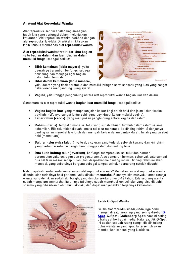Anatomi Alat Reproduksi Wanita from imgv2-1-f.scribdassets.com Yang lainnya hanya bisa orgasme lewat rangsangan klitoris. Dibandingkan dengan pria, wanita memiliki lebih banyak titik dalam menerima rangsangan yang menghasilkan orgasme. Area ini akan membesar saat disentuh, yang membuat wanita jadi lebih peka. Reaksi yang ditimbulkan biasanya cukup membuat pria ingin menemukan kembali sumber kenikmatan tersebut. Perannya adalah wanita dapat mengalami orgasme ketika area sensitif yang itu distimulasi. Titik kenikmatan ini terletak di bagian paling atas dinding vagina, dan berada di antara bibir vagina. Ada dua titik rangsangan utama yaitu: Cara merasakan leher rahim 9 langkah dengan gambar wikihow.