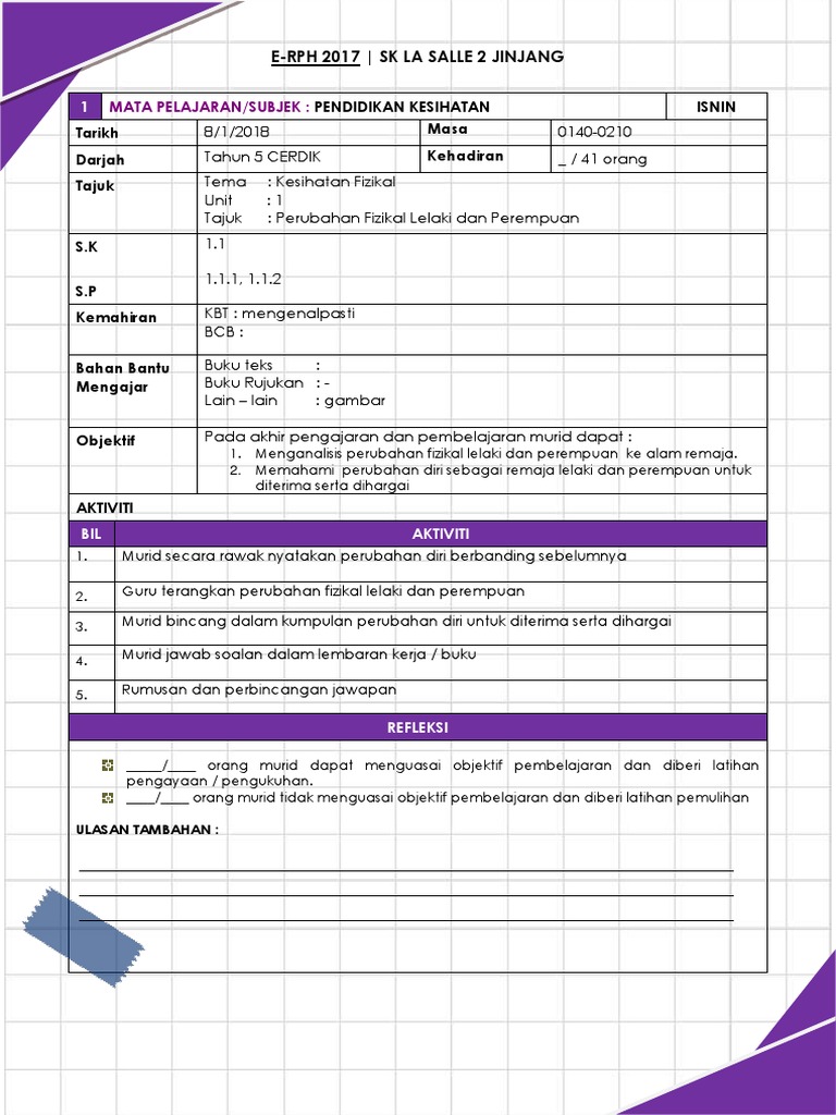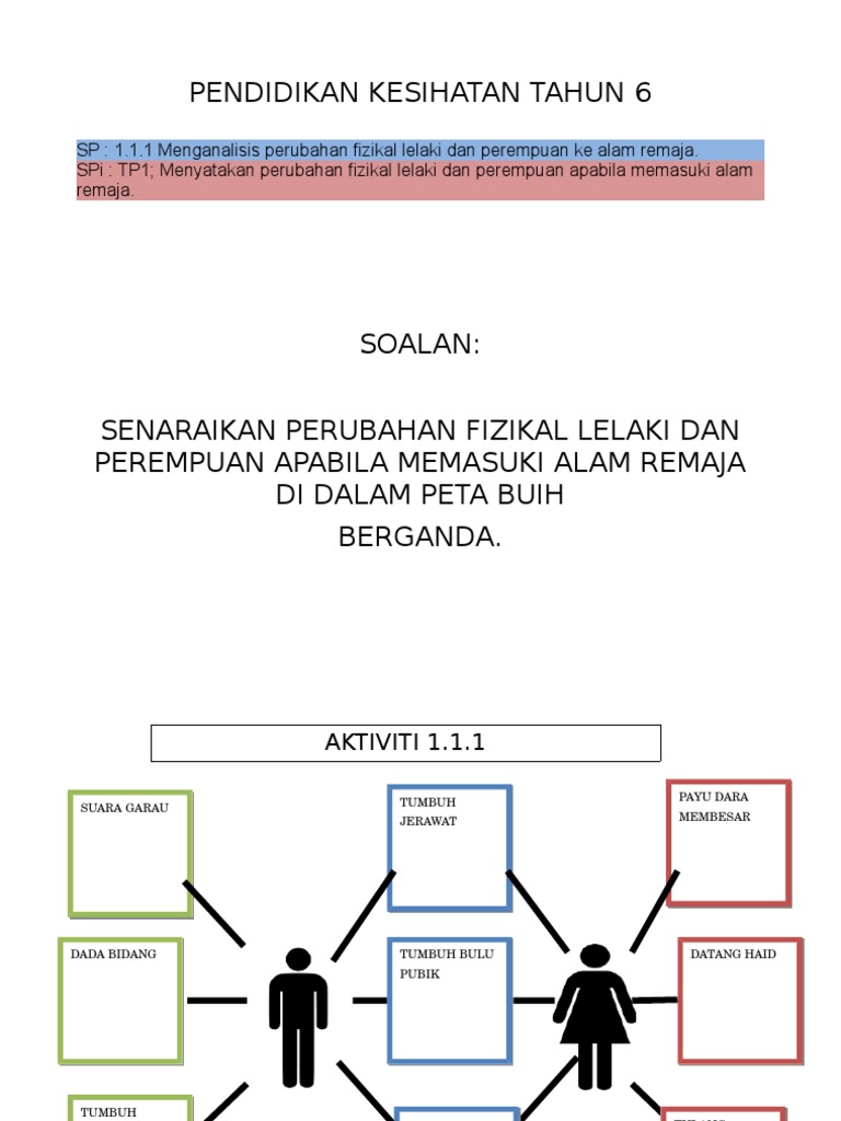 1.1.2 memahami perubahan diri sebagai remaja lelaki dan perempuan untuk diterima serta dihargai. Pendidikan kesihatan keluarga, aspek fizikal, ppk, kpm. Perubahan fizikal lelaki dan perempuan apabila memasuki alam remaja. Terdapat perubahan wujud bersama pada lelaki dan perempuan, iaitu saiz badan, peningkatan kekuatan tenaga dan stamina. Malah kadar pembesaran adalah berbeza di antara seseorang individu dengan individu yang lain.